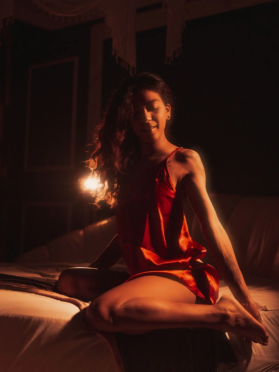 En esta fotografía, el estilo boudoir se centra en crear un ambiente de misterio y calidez. Imagina una habitación, con una iluminación que baña tu piel en tonos dorados, resaltando tus curvas y expresiones naturales. La modelo lleva un slip rojo satinado que contrasta con las sábanas blancas, evocando pasión y elegancia. Su pose —sentada cómodamente en la cama, con un tatuaje visible en el brazo— transmite confianza y juguetearía, recordándonos que el boudoir no es solo sobre belleza externa, sino sobre celebrar quién eres.